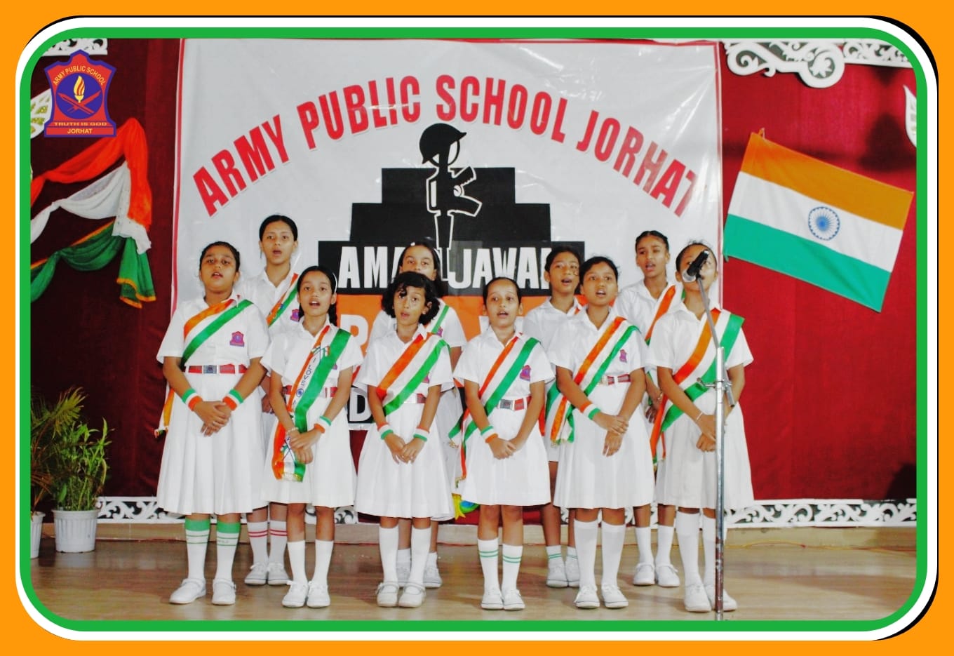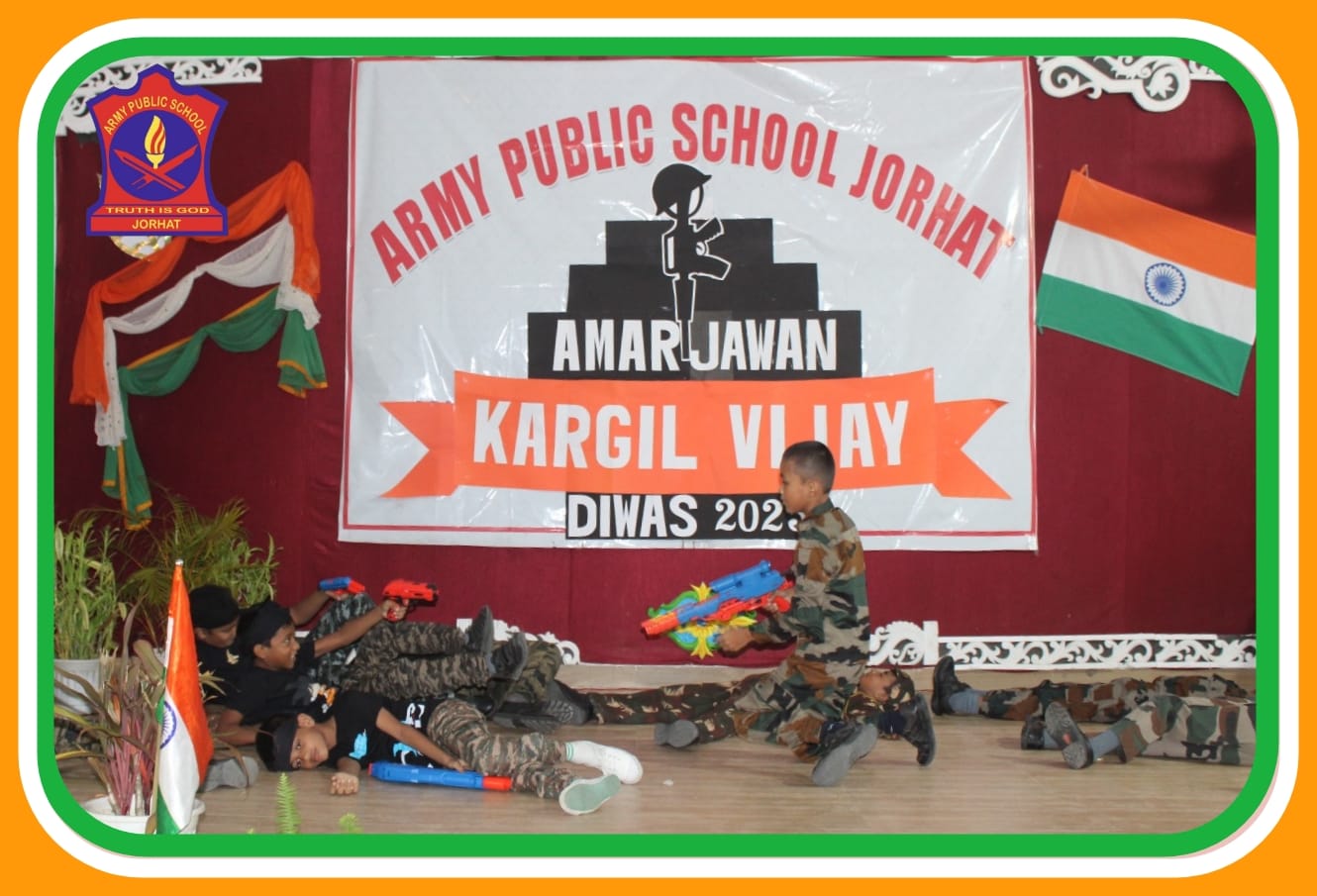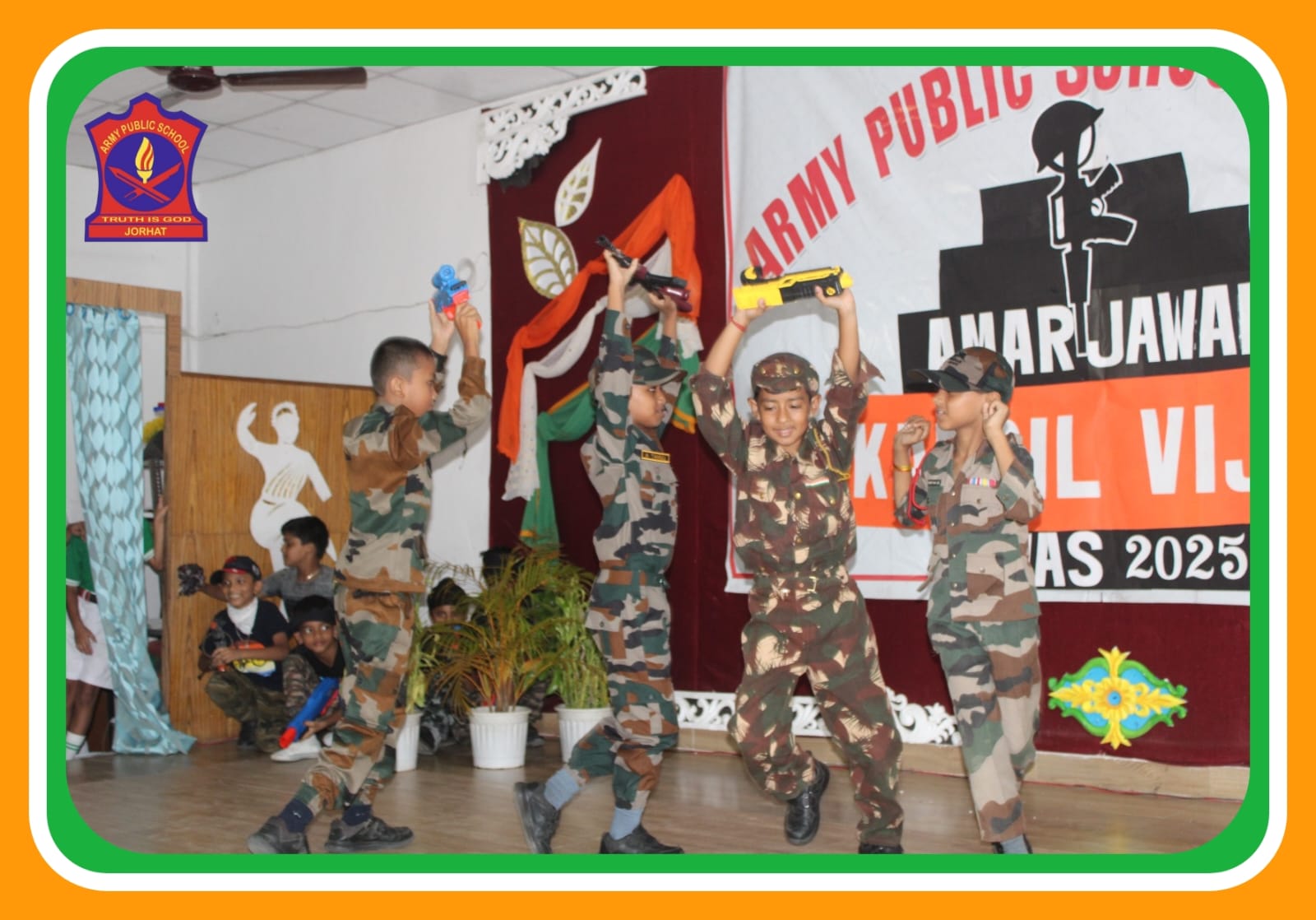 Army Public School, Jorhat, commemorated Kargil Vijay Diwas with deep reverence and patriotic zeal to honour the bravery and sacrifice of the Indian Armed Forces during the Kargil War. The special assembly began with the soulful rendition of the prayer song "Hum Ko Man Ki Shakti Dena," followed by an inspiring thought by Captain Vikram Batra, Param Vir Chakra awardee. Nibeer Nayan Das moved the audience with a heartfelt self-composed poem, encapsulating the spirit of valour and sacrifice. Shrubansu Shekhar Sahu delivered an impactful speech, setting the tone for the day's observance. A captivating skit followed, portraying the emotional farewell of a soldier to his family, a dramatic battlefield encounter, and a moving tribute to martyrs through a soldier's letter home. Vivaan’s speech on the significance of Kargil Vijay Diwas and Reyansh’s tribute to Captain Manoj Pandey, PVC, added depth to the occasion. The group rendition of patriotic songs "Ae Mere Watan Ke Logon" and "Sandese Aate Hain" evoked strong emotions and national pride among all present. The observance concluded with the National Anthem, paying homage to the valiant heroes of Kargil. The programme was a stirring reminder of the courage, commitment, and supreme sacrifice of our soldiers, instilling in students a deeper sense of patriotism and gratitude.